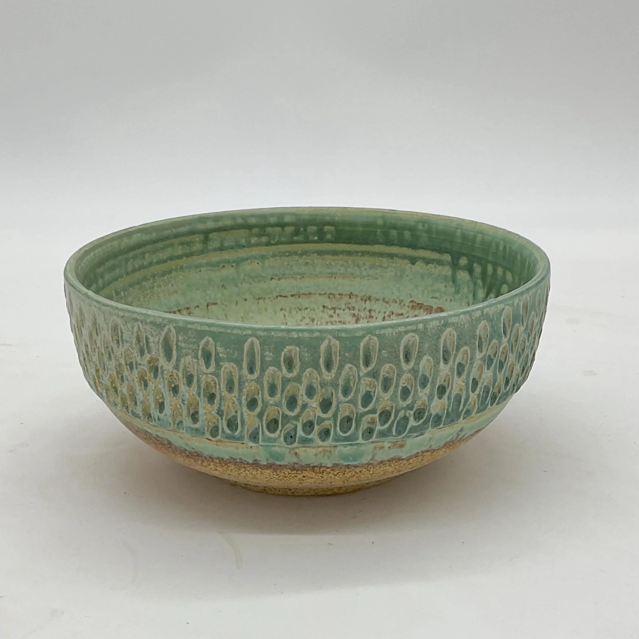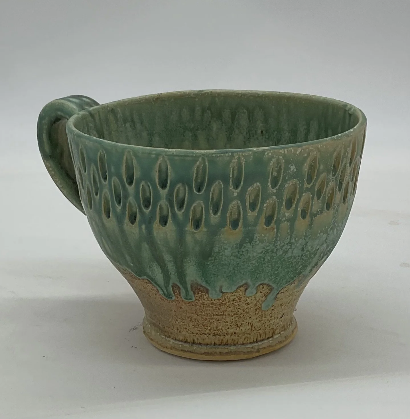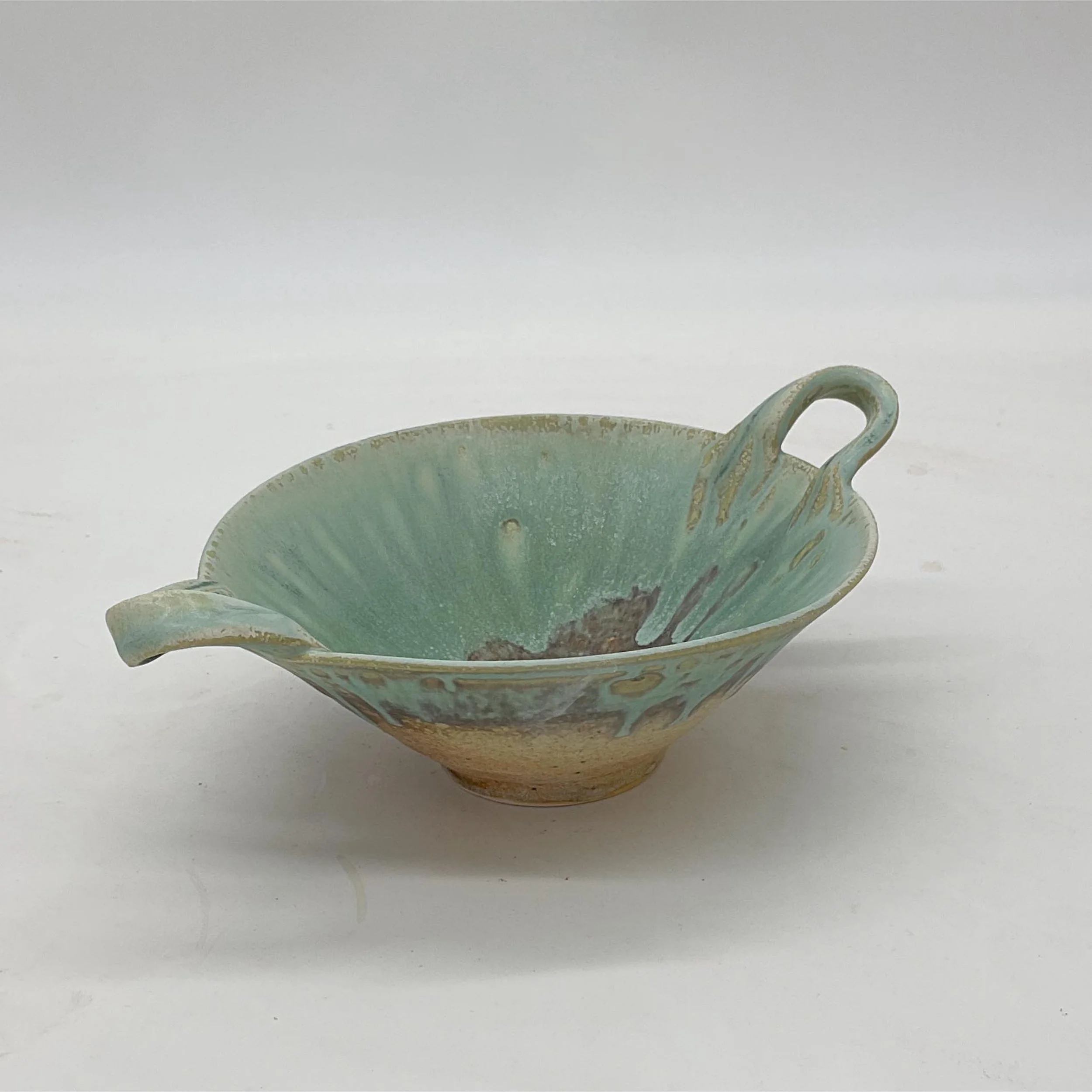 Speckled Dog pots are wheel thrown and hand-built, made of a high-fired porcelain-based clay, then carved and bisque-fired. Glazes are layered onto each piece with a spray gun and re-fired. The layering of glazes allows for a multitude of color variations and shine. These handcrafted pots are perfect for daily use. Tableware is dishwasher safe.
