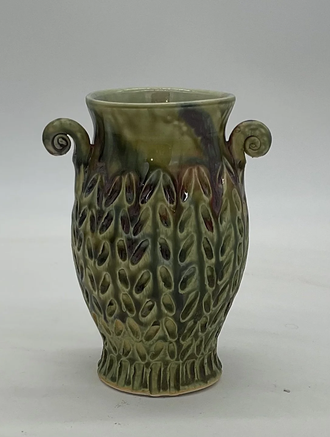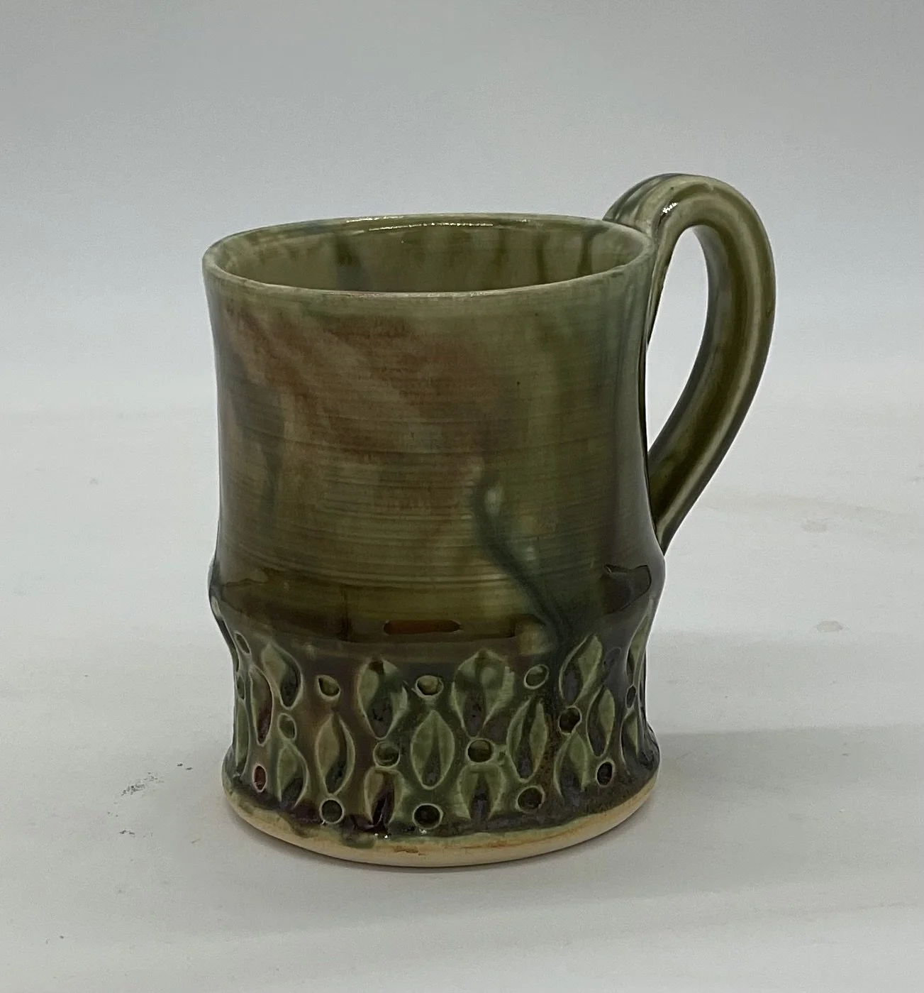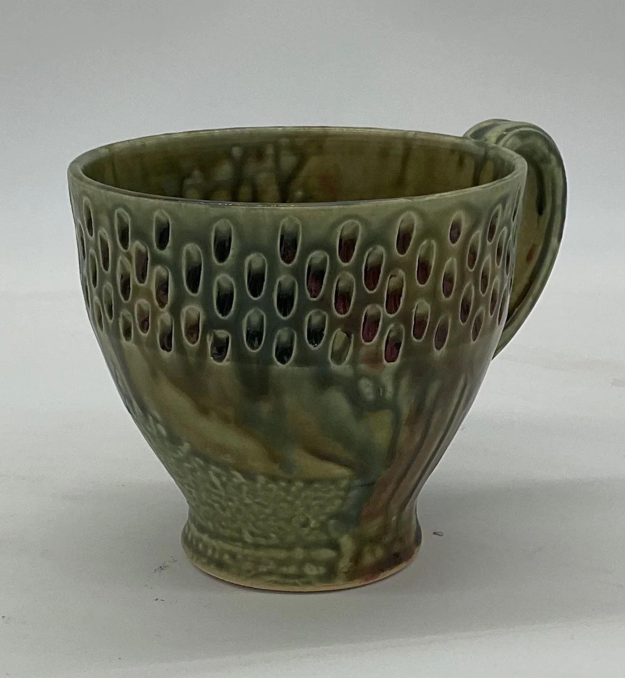 Speckled Dog pots are wheel thrown and hand-built, made of a high-fired porcelain-based clay, then carved and bisque-fired. Glazes are layered onto each piece with a spray gun and re-fired. The layering of glazes allows for a multitude of color variations and shine. These handcrafted pots are perfect for daily use. Tableware is dishwasher safe.